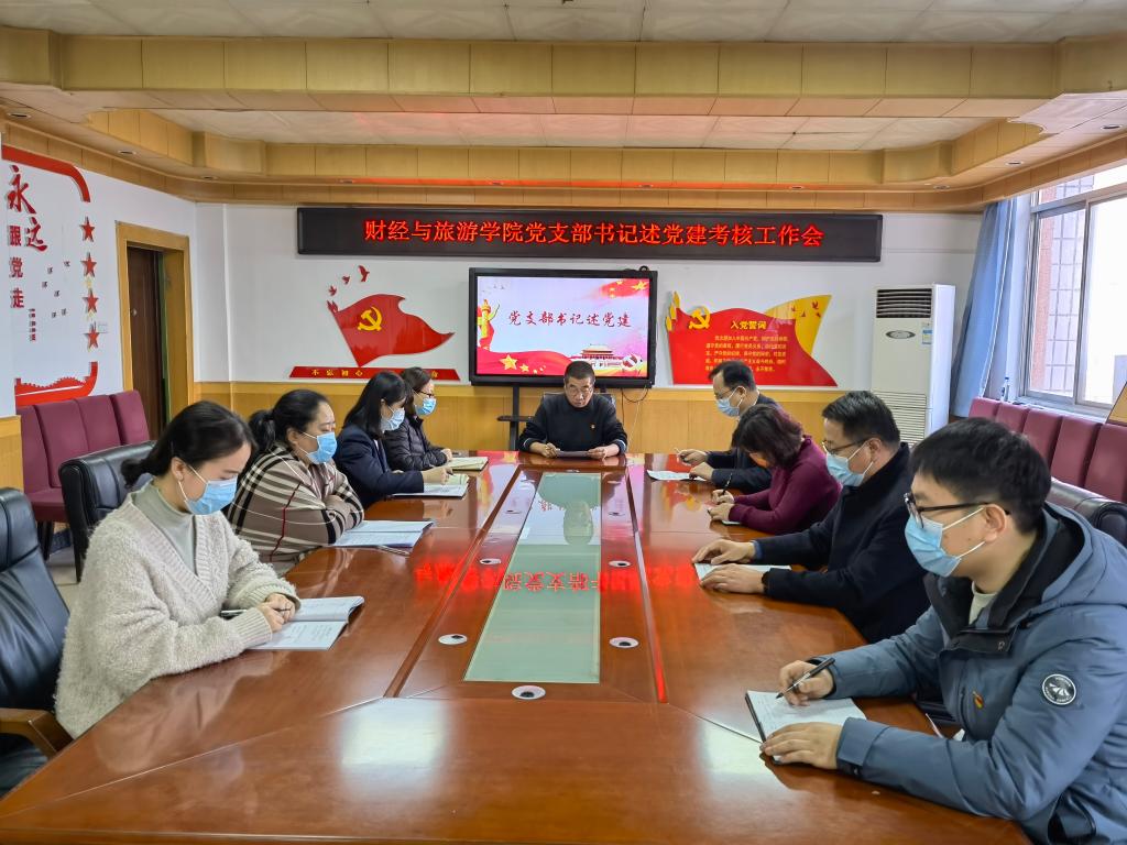 按照学校党委《关于2021年度党组织书记抓党建工作述职评议考核的通知》的安排,2022年1月14日下午,财经与旅游学院党总支召开党支部书记述党建考核工作会,会议采取线上线下相结合的方式,现场述职在格物楼408会议室举行,在校党总支委员、支部委员现场参会,其余未在校支部委员线上参会,党总支书记孙继龙主持会议。