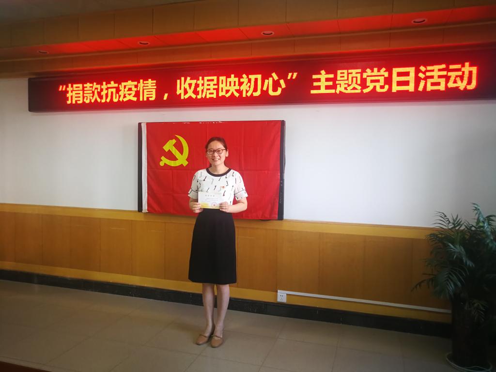 活动中,总支书记孙继龙同志首先介绍了开展此次主题党日活动的目的、意义,介绍了今年疫情发生后,全国党员积极响应党中央号召,纷纷通过自愿捐款的方式支持疫情防控工作,彰显了家国情怀,汇聚了人间大爱,用责任和担当诠释了共产党员的初心和使命。接着党总支组织委员仝丹娜同志向与会党员通报了本次党员捐款情况,财经学院党员自愿捐款11772元,其中42名教师党员捐款8800元,学生党员捐款2972元。随后,孙继龙同志分别给党员一一颁发了《捐款收据》,一张张印有中共中央组织部红色印章的“捐款收据”,带有党员独特“身份编号”证书郑重递到了捐款党员的手中。各位党员接到收据后,心潮澎湃,纷纷踊跃参加“我与收据合张影”活动,在党旗前与《捐款收据》合影,用影像保留这珍贵一刻。一张收据就是一份肯定,一名党员就是一面旗帜;一张收据承载着党员齐心抗疫的决心,一个影像记载的是每位党员忠诚于党和人民的初心。支持新冠肺炎疫情防控工作,是每一名党员践行初心使命的实际行动,也是我院“不忘初心,牢记使命”主题教育成果的具体体现。孙继龙书记希望全体党员把《捐款收据》作为党员彰显使命担当的红色见证,要妥善保管,珍惜荣誉,并时刻牢记党员身份,永远与党同心同德,为党的事业贡献力量。