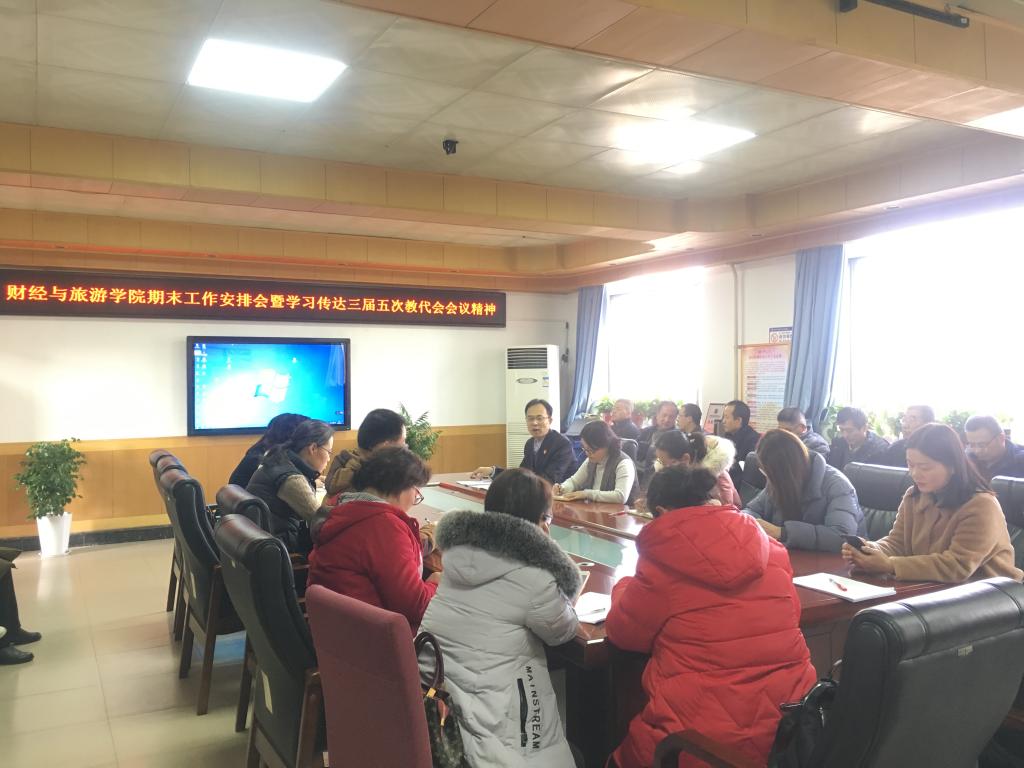 1月11日下午,财经与旅游学院在格物楼408会议室召开期末工作安排会暨学习传达三届五次教代会会议精神。会议由财经与旅游学院院长吴姗娜主持,财经与旅游学院书记孙继龙及全体教职工参加了会议。