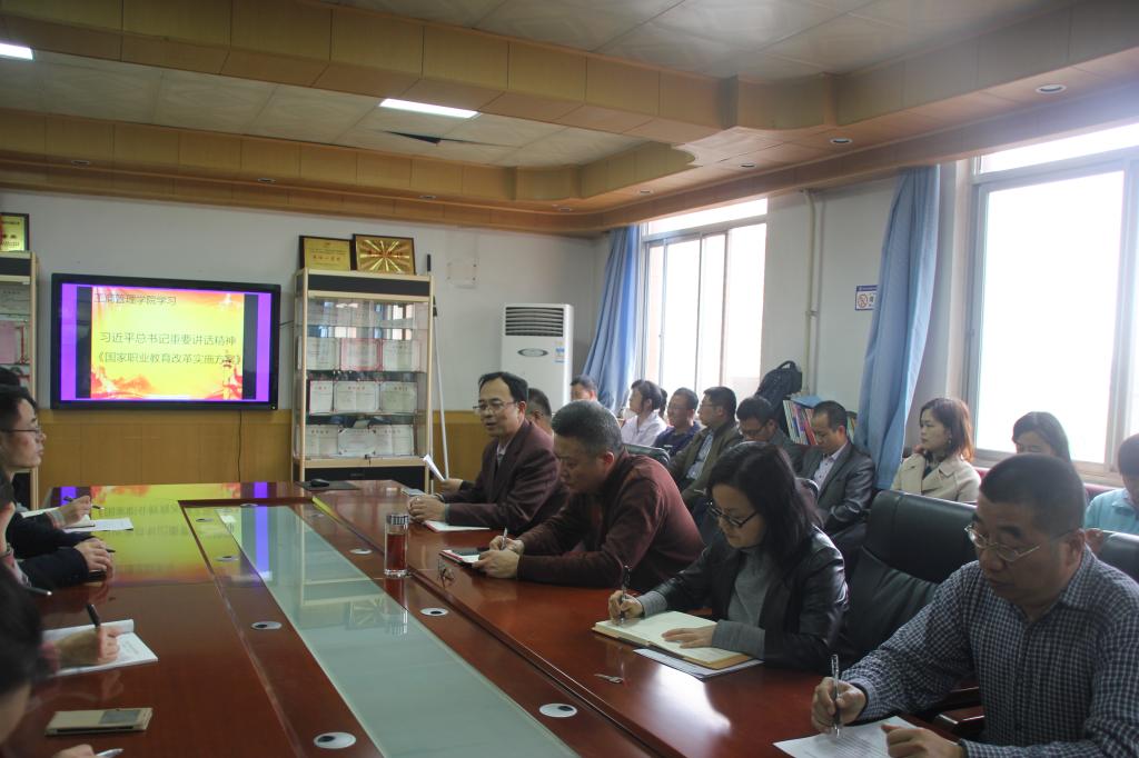 3月27日下午,工商管理学院在格物楼408会议室举行了专题学习会,组织全体教职工学习“习近平总书记在学校思想政治理论课教师座谈会上重要讲话精神”和《国家职业教育改革实施方案》。会议由该院党总支书记孙继龙主持。