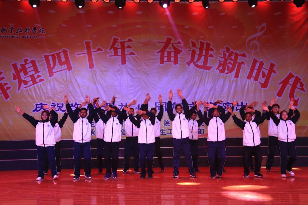 整场演出以“感党恩、颂改革、忆发展、促和谐”为主线,献礼改革开放四十周年。舞蹈、朗诵、歌曲、小品、合唱、乐器演奏精彩纷呈,全方位展现了我院青年学子热爱伟大祖国,讴歌新时代,奉献青春力量,砥砺奋进的精神风貌。留学生带来的《孟加拉民族舞蹈》和《功夫扇》展现了我院留学生多才多艺的精神风貌;歌曲联唱《最初的梦想》、《高飞》、《爱永远在心中》表现了我院青年学子致敬新时代,追逐奋斗梦想,绽放青春光彩的强烈愿望;小品《新闻联播-共话改革》以诙谐幽默的语言呈现了改革开放以来人民生活水平显著提高,群众有了更多的获得感、幸福感;舞蹈《礼仪之邦》以汉朝歌舞的艺术形式,展现出我国优秀的传统文化精髓。最后,晚会在激情澎湃的大合唱《国家》中圆满落下帷幕。