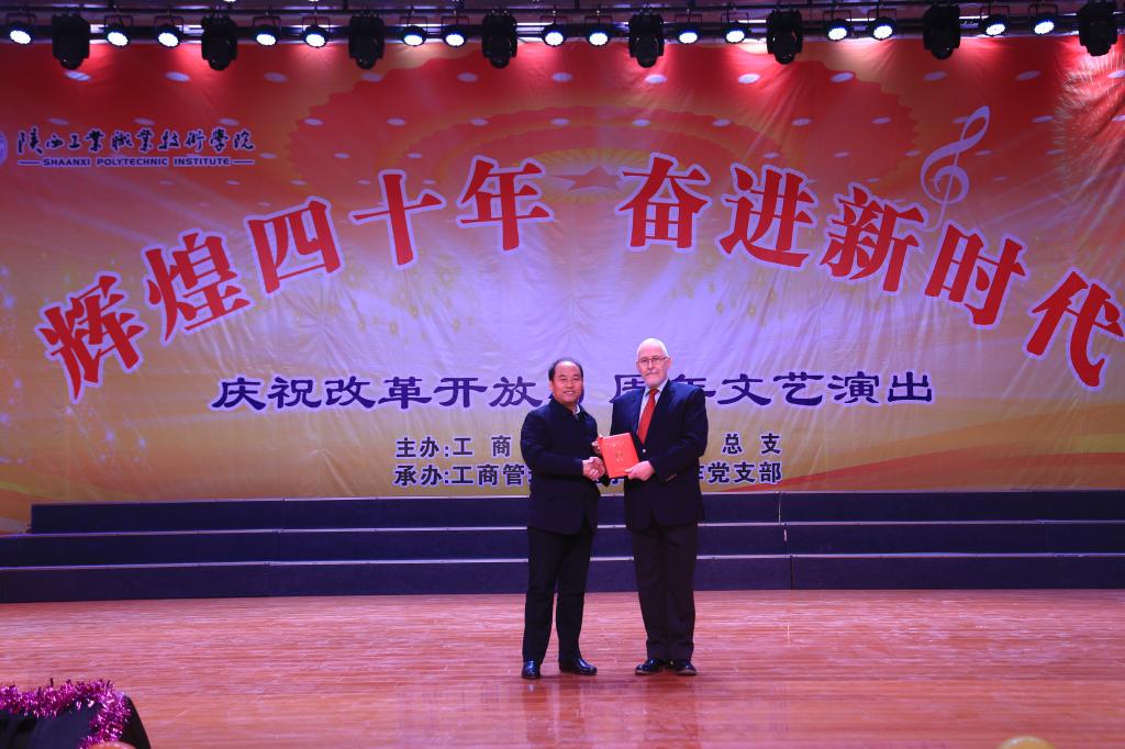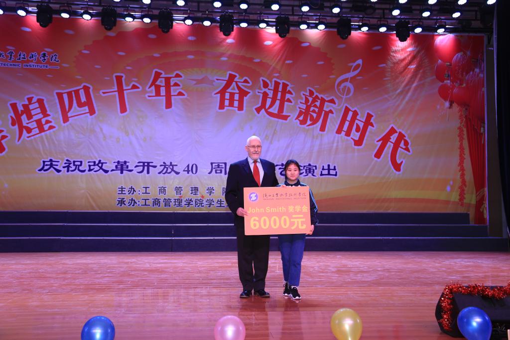 在演出现场,副院长梅创社为我院澳大利亚籍外教约翰·史密斯(John Smith)颁发了捐赠证书。史密斯来工院十年期间,慷慨解囊,拿出自己多年积蓄70多万元,为学生举办大型联谊活动,并专程从国外订制奖品及纪念品,受益学生上千人。从去年开始,他设立“约翰·史密斯奖学金”,奖金六千元,专门奖励商务英语专业品学兼优的大二同学。随后,外教约翰·史密斯也为今年获此殊荣的商英1701班杨晨同学颁发了“John Smith”奖学金。