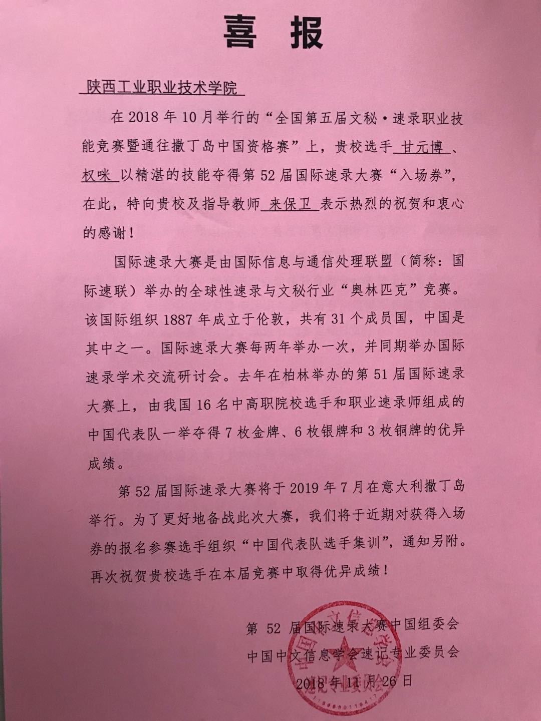 近日,第52届国际速录大赛中国组委会、中国中文信息学会速记专业委员会给我院发来喜报,工商管理学院文秘专业学生甘元博、权咪获得2019年在意大利撒丁岛举行的第52届国际速录大赛“入场券”,并受邀参加“中国代表队选手集训”备战国际大赛。这是我院文秘专业学生技能水平的又一次展示,标志着该专业学生具备了在国际赛场参与角逐与竞争的实力。
