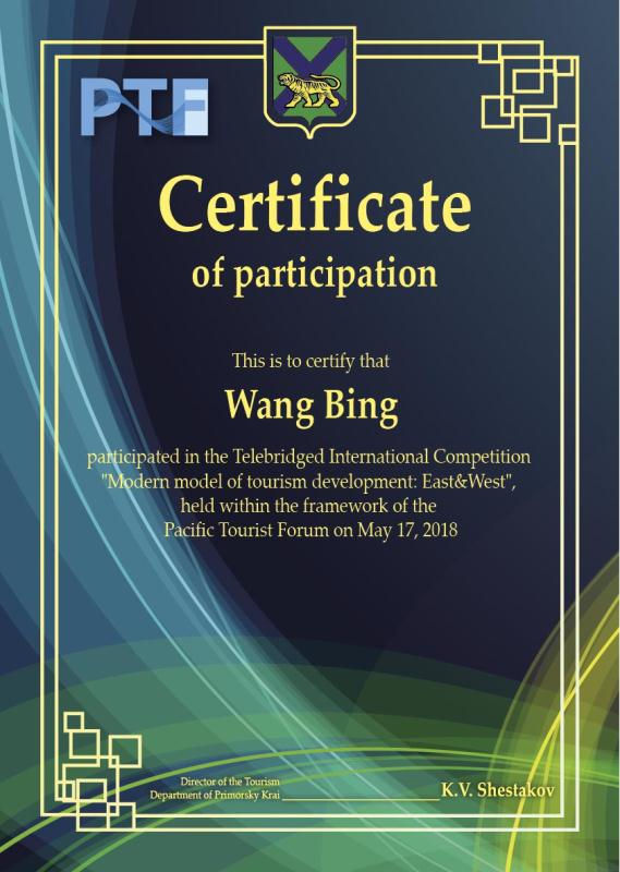 2017年5月17日,我院工商管理学院商务英语专业学生在商务英语教研室教师郑琳靖、John Smith以及旅游管理教研室的张娟飞老师的精心指导之下,首次参加俄罗斯远东联邦大学、海参崴州立大学经济与服务学院主办、普里莫尔斯市游客信息中心协助举行的太平洋地区国际旅游者论坛竞赛项目中获得三等奖。