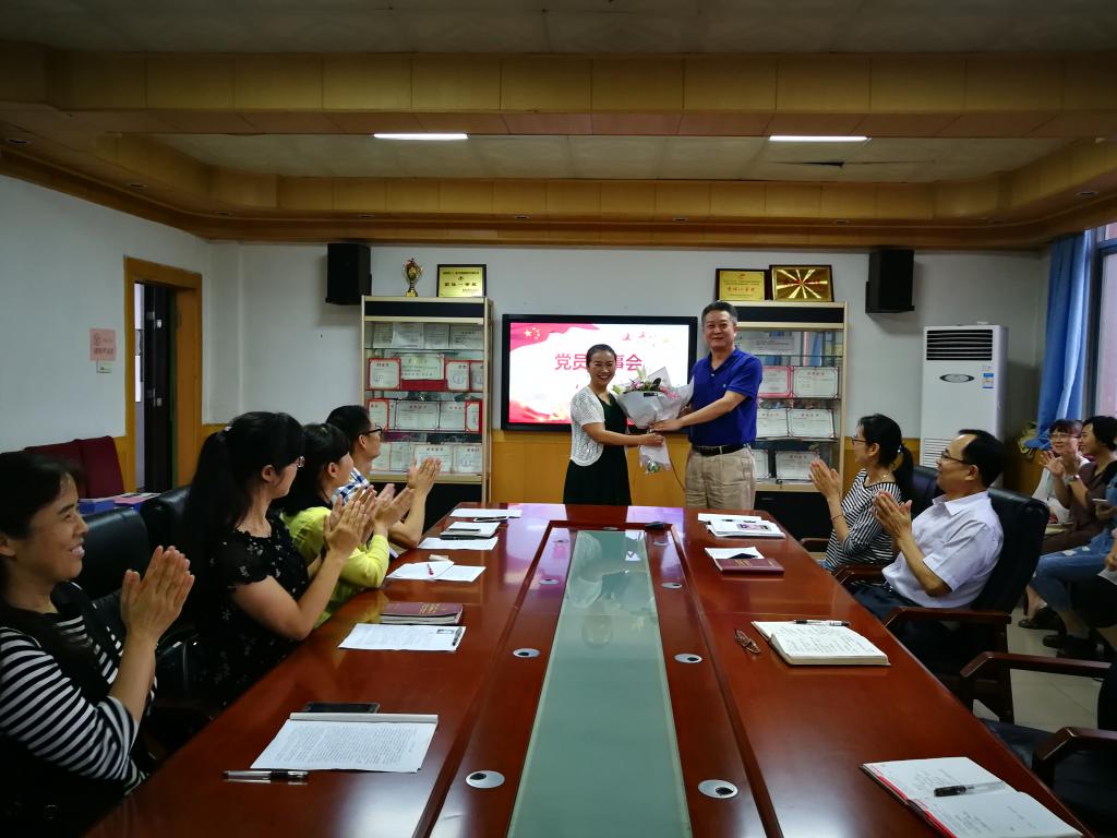 此次活动由党员“讲自己的故事”和“讲典型共产党员的故事”两部分组成。会上,首先由近两年受表彰的五位优秀共产党员分享自己的感人故事。会计教研室杨琳老师分享了她在开发基础会计在线开放课程中从困惑、学习、探索、到后期的制作、录制、全力以赴按期完成任务的艰辛历程;管理教研室田建平老师分享了他通过探索,积极主动出击,把握各类与管理相关大赛的机会,最终获得全国第十届企业沙盘大赛一等奖的故事;学工办郭晓莹老师分享了她今年承办两项大型文艺活动的故事,春运会开幕前夕半个月,利用业余时间、双休日加班加点排练出400人彩绸舞,并在七一前夕成功组织了庆祝中国共产党成立97周年大型文艺演出;文秘教研室来保卫老师分享了他近期看世界杯的感悟,从足球赛到技能大赛,无不印证着团体精神的重要性,这都是指导大赛的秘籍……一件件点滴、平凡的小事,反映出了共产党员在平凡岗位上体现出的不忘初心、无私奉献、不求回报、恪尽职守的职业精神和优秀品质。特别是本月底即将退休的郭晓莹老师,没有因年龄大或是即将退休而退缩,不计个人得失,牢记使命,站好最后一班岗,为广大年轻党员树立了良好的榜样。在活动现场,工商管理学院韩文飞院长向老党员郭晓莹同志献上鲜花,为她的坚持、她的初心点赞,与会同志报以长时间热烈的掌声,将现场气氛推向了高潮。随后,党员代表刘娜、杨红、解晶、赵玉静分别分享了卢永根、柯小海、陈士橹、刘永生四位优秀共产党员的先进事迹,发生在他们身上的感动故事,无不印证了共产党人严以律己、默默付出、无私奉献的感人精神。