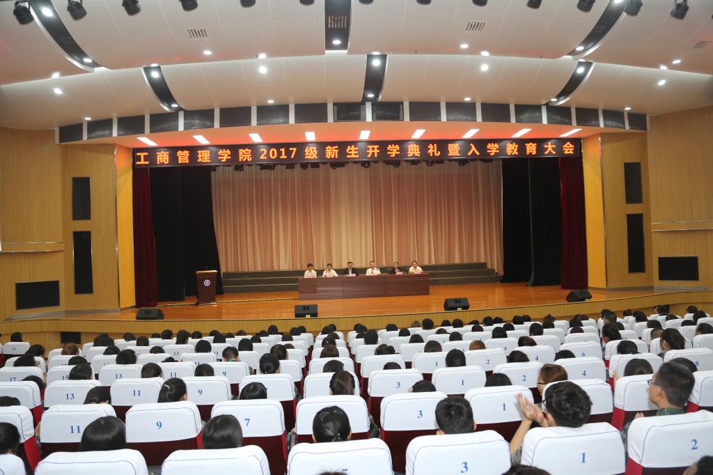 9月7日上午九时许,工商管理学院在明德堂大礼堂举行2017级新生开学典礼暨入学教育大会,工商学院党总支书记孙继龙、院长韩文飞、副院长吴姗娜、学工办主任杜娟、教学办主任赵利娟、实训中心主任张联朋、2017级辅导员狄莹莹以及670余名新生参加了会议。会议由该院党总支书记孙继龙主持。