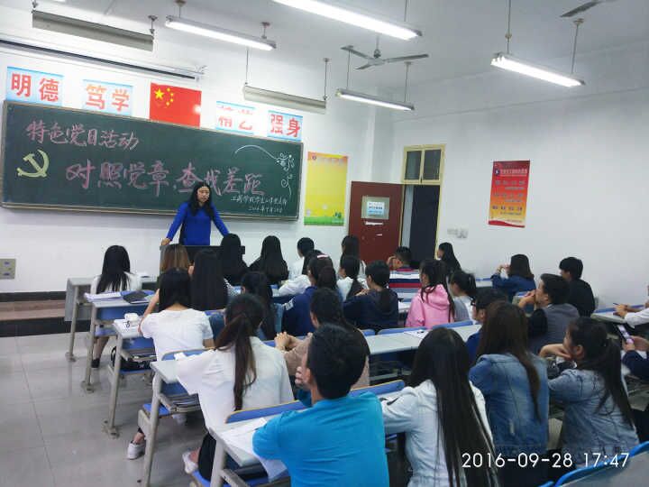 9月28日下午4:30到6:00,工商管理学院学生工作支部,按照学院“两学一做”活动要求,在工商学院学工办办公室和崇文南楼c210教室,分别对教师党员和学生党员开展了“对照党章,查找差距”的特色党日活动,活动以座谈会的形式开展,学工支部全体教师党员及学生党员参会。党支部书记杜娟主持本次会议。