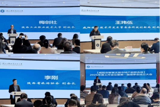 11月15日,咸阳市智慧文旅市域产教联合体2025年度工作会议暨第一届理事会成立大会在我校渭城校区举行。咸阳经济技术开发区管委会科技创新局、陕西省旅游协会、咸阳市文化投资发展有限公司、西安旅游职业中等专业学校等政、行、企、校代表,以及咸阳市文化和旅游局、秦都区文化和旅游局、咸阳博物院、华住集团、茂陵博物馆等31家成员单位代表共同出席会议。会议由陕西工业职业技术大学财经与旅游学院院长何奇彦主持。