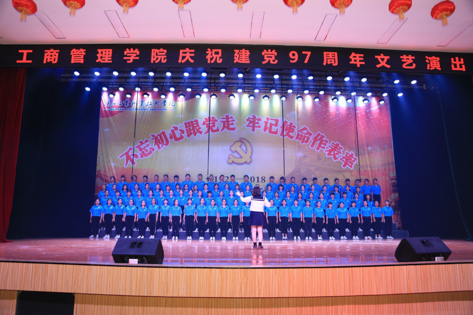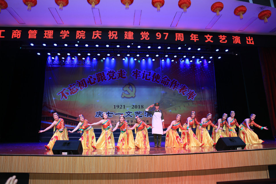 为了庆祝中国共产党成立97周年,持续推进“两学一做”学习教育常态化制度化,激励广大党员不忘初心、牢记使命,6月26日下午,由工商管理学院党总支主办,工商管理学院学生工作党支部承办的主题为“不忘初心跟党走、牢记使命作表率”庆七一文艺演出在明德堂隆重举行,工商管理学院院长韩文飞、党总支书记孙继龙出席。