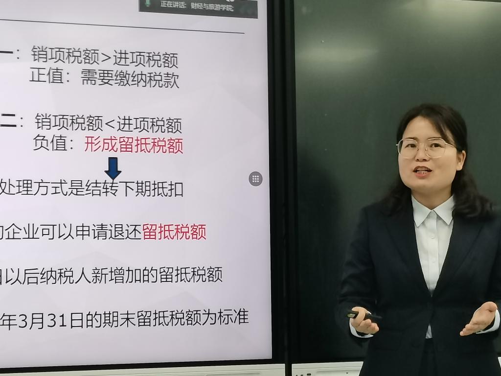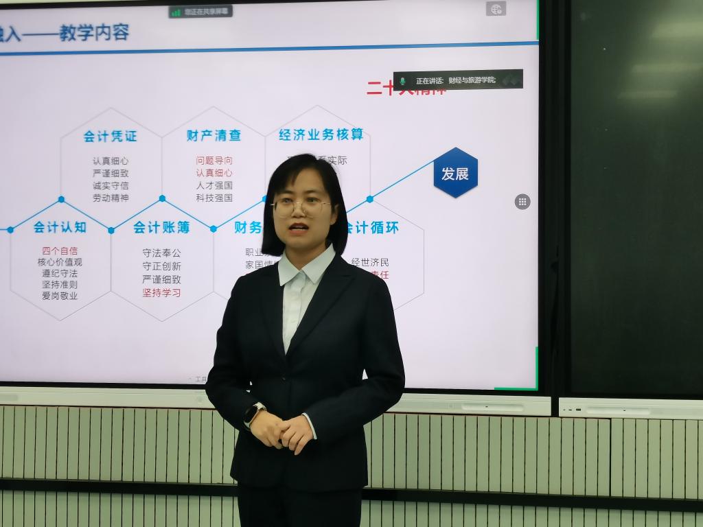 活动共分为2个环节。第一个环节由赵玉静、张路程和雒祎凡、李萍等4位老师分别对《基础会计》《智能化税费申报与管理》课程进行课程思政说课和教学展示。4位老师分别从2门课程的思政建设总体设计、教学实践、评价与成效以及特色与创新等七个方面和课程思政元素在课程实施过程中的挖掘、融入与呈现情况进行讲解和展示。