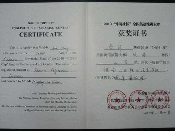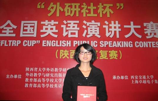 11月20日,2010年“外研社杯”全国英语演讲大赛——陕西赛区复赛在西安交通大学逸夫科学馆国际会议中心举行,我院商务英语专业0903班学生吝萌在比赛中表现出色,荣获三等奖。本次大赛于今年5月启动,由教育部高等学校大学外语教学指导委员会、教育部高等学校英语专业教学指导分委会和外语教学与研究出版社主办,西安交通大学承办。比赛经过层层选拔,共有44名选手入围陕西赛区复赛。比赛中,我院吝萌同学在和众多研究生、本科生同台竞技中,不畏强手,沉着冷静,经过定题演讲和即兴演讲两个环节的激烈比拼,最终荣获三等奖,为学院争得了荣誉。