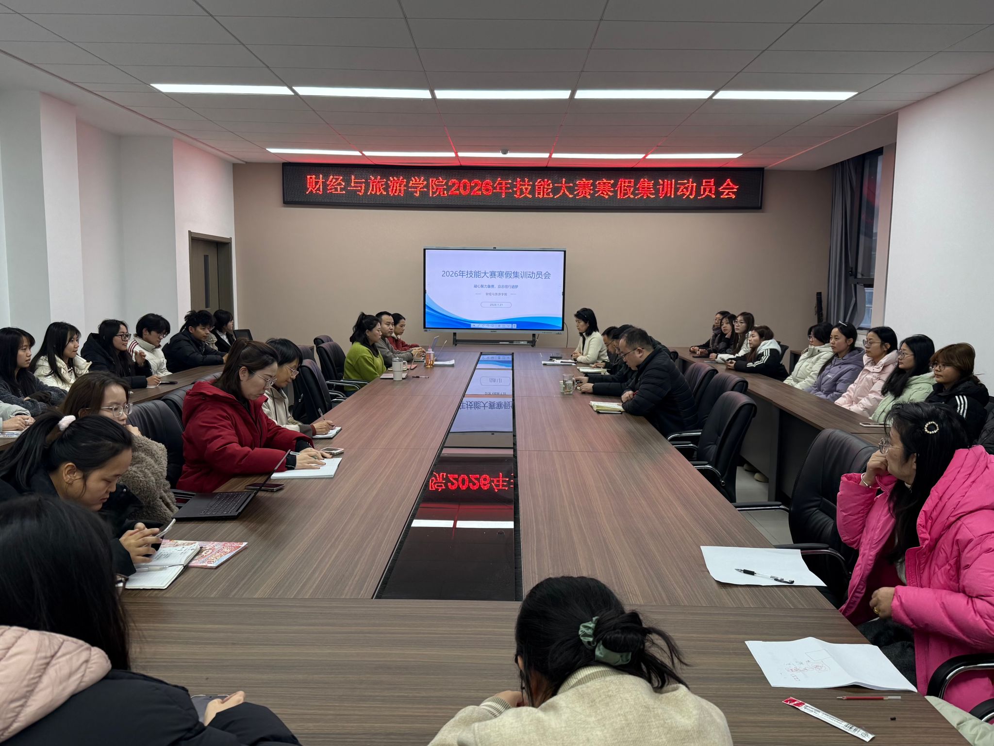 为凝聚备赛共识、明确集训要求、提升参赛实力,1月21日,财经与旅游学院在崇理楼D504召开2026年技能大赛寒假集训动员会。学院院长何奇彦、教学办主任仝丹娜、学工办主任李友治、全体指导老师及参赛学生参加此次会议,共同为寒假集训蓄力赋能。会议由实训中心主任李思维主持。