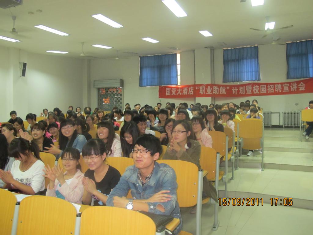 2011年9月15日(周四)下午工商管理学院在崇文西楼103多媒体教室为2012届毕业生举办了首场招聘会。陕西省机械设备进出口公司西美国际部和咸阳国贸大酒店来我院进行了招聘。咸阳国贸大酒店是咸阳市四星级酒店,主要承接市政府等各级各类部门的大型宴会;西美公司是中介劳务派遣公司,将学生外派至新加坡工作,工商管理学院已有两名学生(商英0904:郭萌萌、施杰)通过该公司去新加坡就业。用人单位非常重视此次招聘,西美公司派来了三名招聘工作人员;咸阳国贸大酒店总经理、党总支副书记和人力资源部经理等相关领导都来到了应聘现场。