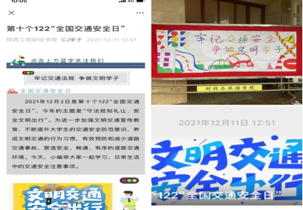 为深入贯彻习近平法治思想和关于安全工作的重要论述,落实学校关于《第十个“全国交通安全日”》活动部署,在广大学生中倡导“生命至上,安全第一”的教育管理理念,进一步加强文明交通宣传教育,不断提升大学生的交通安全防范意识,养成遵规守纪,按章行驶的良好行为习惯,有效预防和减少道路交通事故,营造安全、畅通、有序的道路交通环境。财经学院于12月13日到17日,开展了以“牢记交通安全、争做文明学子”为主题的系列教育活动,成效显著。