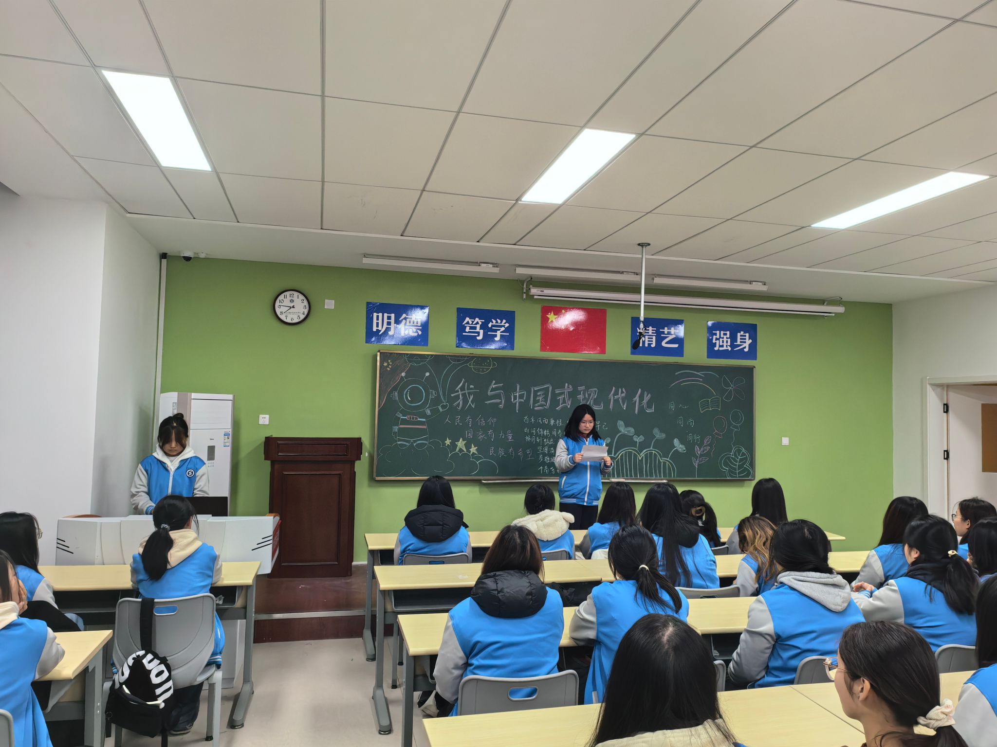 班会伊始,各班在班主任的带领下,系统学习了《党的二十大报告》中关于“中国式现代化”的系列重要论述及相关权威解读文章。通过对“人口规模巨大的现代化”“全体人民共同富裕的现代化”等核心特征的深入研读,同学们对中国式现代化的中国特色、本质要求和战略部署有了更清晰的认知,为后续讨论奠定了坚实的理论基础。